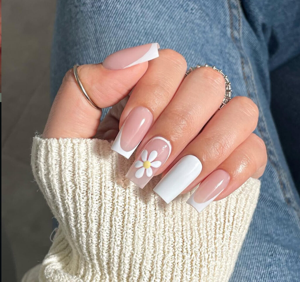 This manicure blends crisp French tips, a solid white accent nail, and adorable daisy art. The color palette stays clean and simple, which makes the design look timeless.