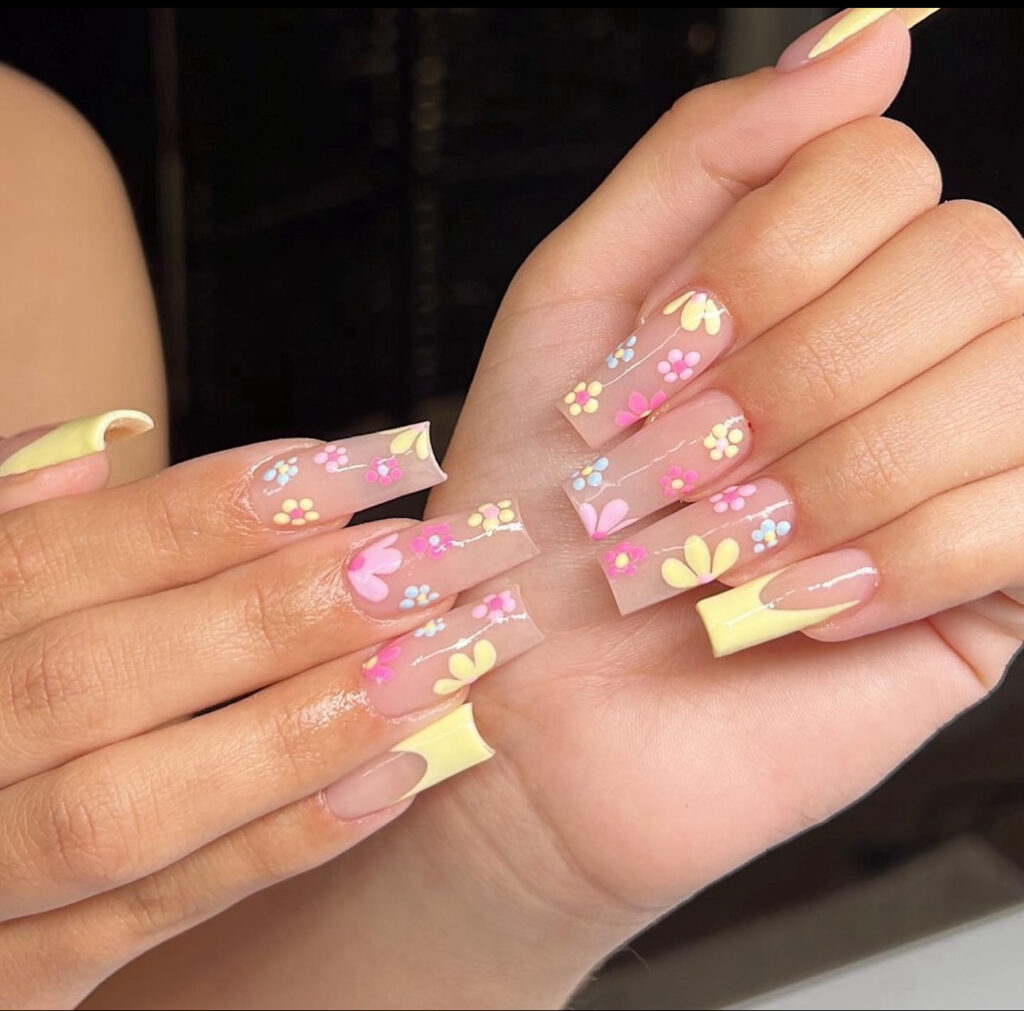 These nails combine soft yellow tips with a clear base and delicate floral art in pink, blue, and yellow. The result feels light, fresh, and playful without looking too busy.